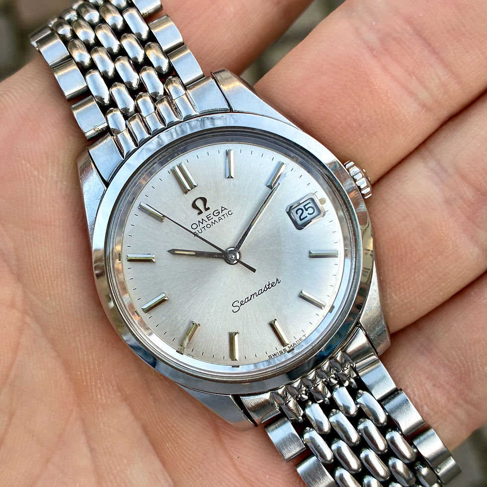 Omega's classic Seamaster De Ville is the definition of stylish. This is one of the ultimate dress watches, which with its low profile fits snugly against the wrist and slides effortlessly under a shirt sleeve. This specimen is vintage at its best and is in formidable condition. The dial has sunburst finsish, and overall this is a watch without any frills. It's minimalist elegance. The watch is newly serviced.